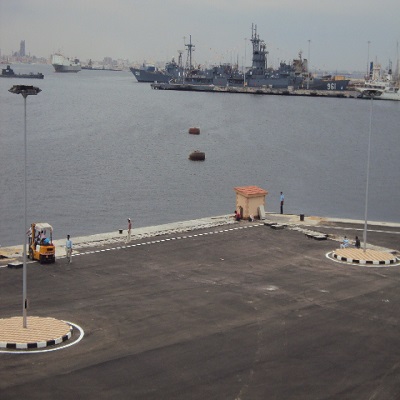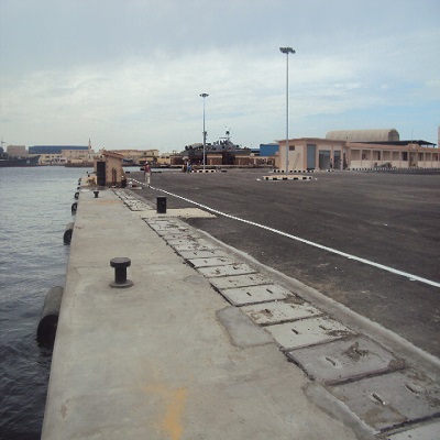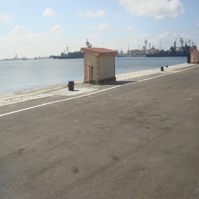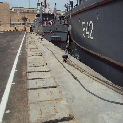 Extended the ninth naval pier's concrete blocks to allow the ships to reach their appropriate depths with 250m long and 40m wide as well as importing and fixing the fenders . We have also done the services for ships as electricity plugs , water , solar and cables as well as finishing touches for the floors and the back area establishing all the layers and covering it with asphalt.